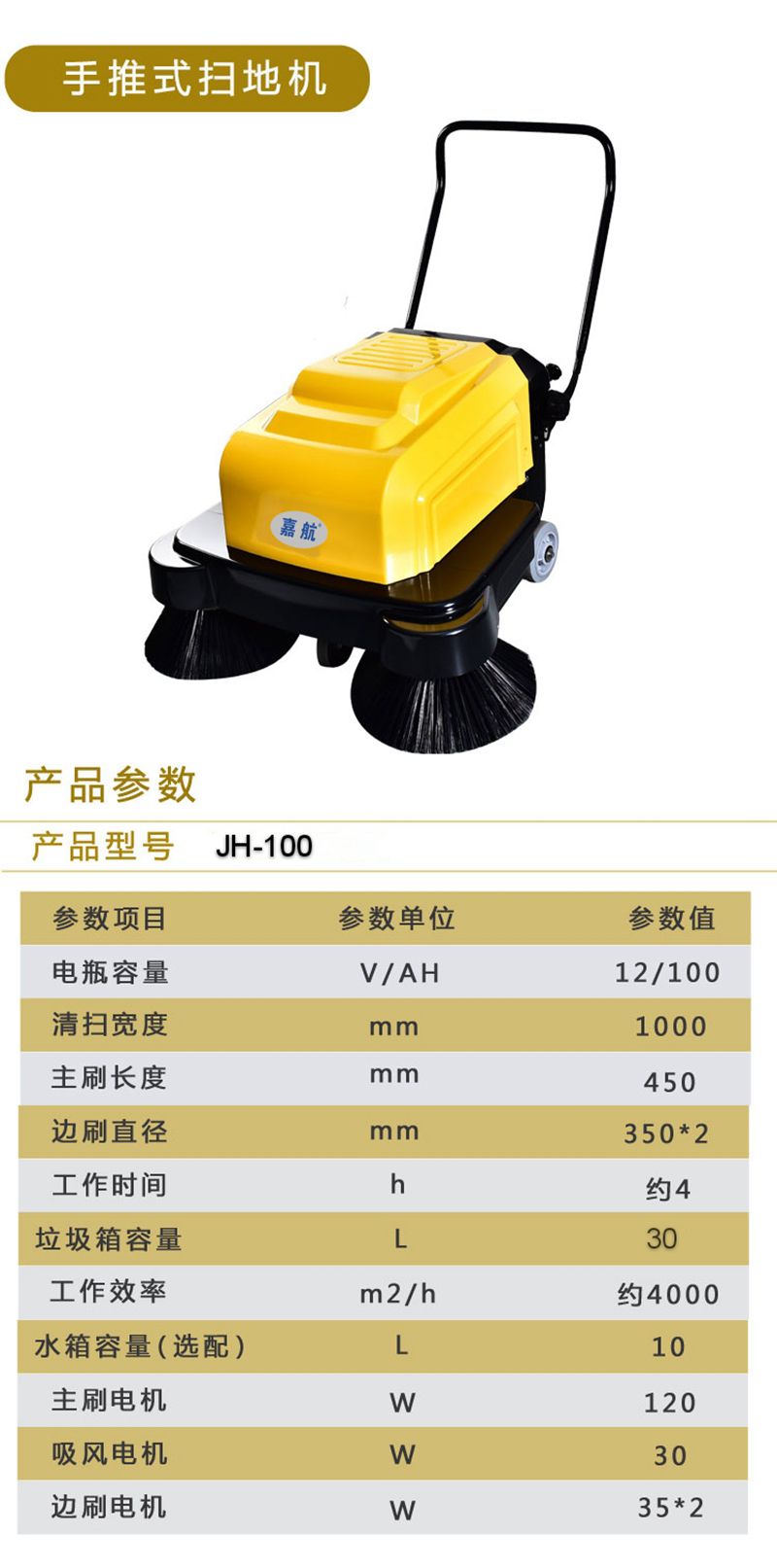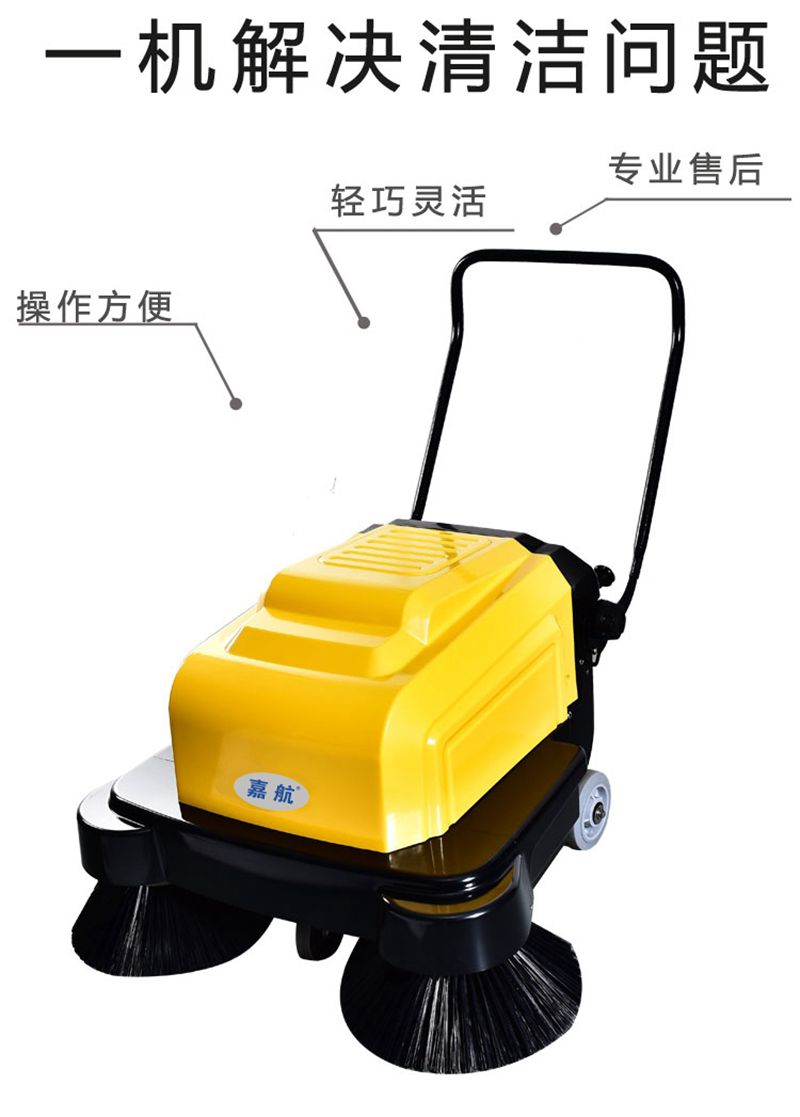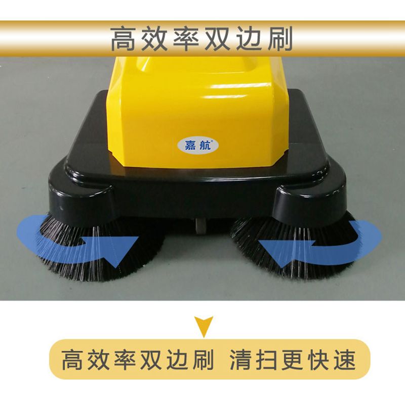 嘉航手推电动扫地机JH-100 仓库清扫地面灰尘用吸扫一体机集扫地、吸尘为一体,整车性能良好,外观设计精巧,大方。做工细致。适用于清扫如粉尘、树叶、烟头,烟盒、小石子等垃圾。广泛使用于学校、车间、车站,码头,宾馆,物业等场所。