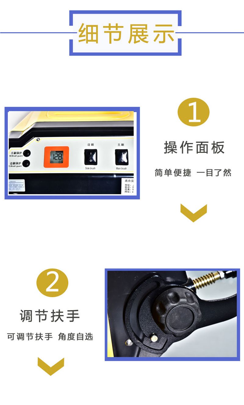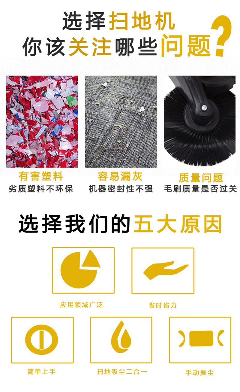 1、手推式吸尘扫地机设计精巧轻便,经济实用,强劲的清扫系统和吸尘,过滤系统使垃圾一扫而光。。